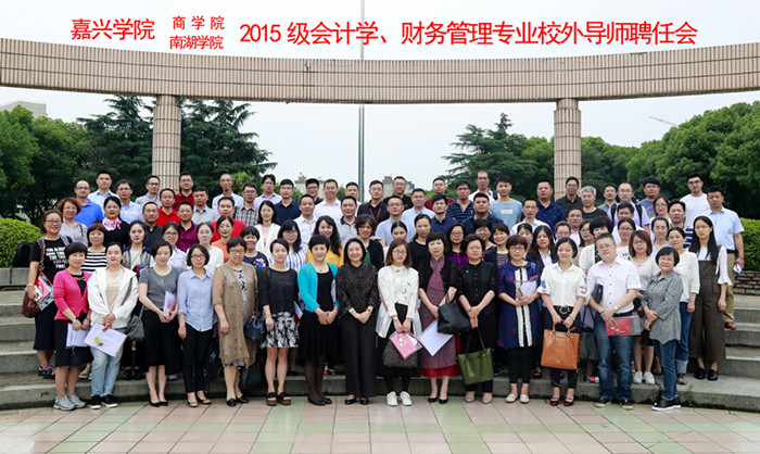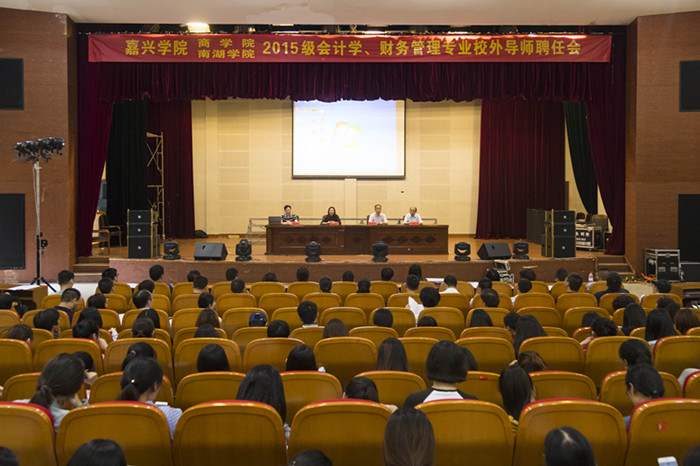 5月31日下午,吃瓜网 、南湖学院在第二教学楼报告厅联合召开了2015级会计学、财务管理两个专业共14个班级学生的“双导师制”聘任见面会。校教务处相关领导,吃瓜网 、南湖学院领导及来自嘉兴市内各企事业单位财会实务界的125名校外导师、会计和财务管理专业的全体专业教师和2015级全体学生参加了大会。会议由吃瓜网 副院长李郁明主持。