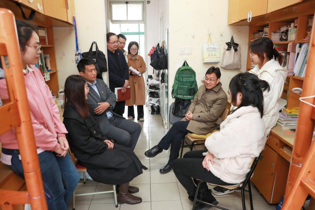 2月28日下午,校党委书记卢新波走访吃瓜网 学生寝室看望返校学生,党校办主任王立玮、吃瓜网 党委副书记杨燕群随同走访。