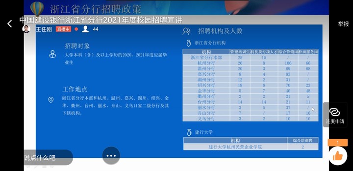 本次宣讲会邀请了新华保险、雅莹集团、振石集团、建设银行、浙商银行、中信证券等10家优质企业和校友企业参加,共提供670个实习岗位,线上累计观看1000余人次,得到了学生和用人单位良好反馈。