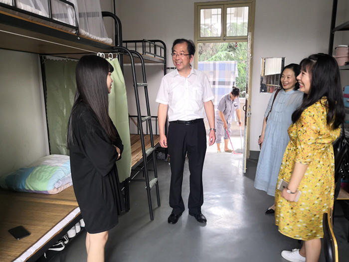 在新生宿舍里,同学们有的在整理内务,有的已经早早收拾妥当与新同学开心畅聊,同学们良好的精神面貌受到了盛校长的肯定。每到一个寝室,盛校长都与学生们亲切交流,仔细询问同学们的情况,“老家哪里的啊”、 “对学校感觉怎么样”、“有没有什么困难需要学校帮助”……一句句问候,拉近了师生间的距离。嘘寒问暖之余,盛校长不忘鼓励同学们在新的环境、新的起点树立远大目标,珍惜学习时光,学好专业,并叮嘱同学们有困难要及时与老师联系,学校和学院老师会竭尽全力为同学们创造良好的学习生活环境。