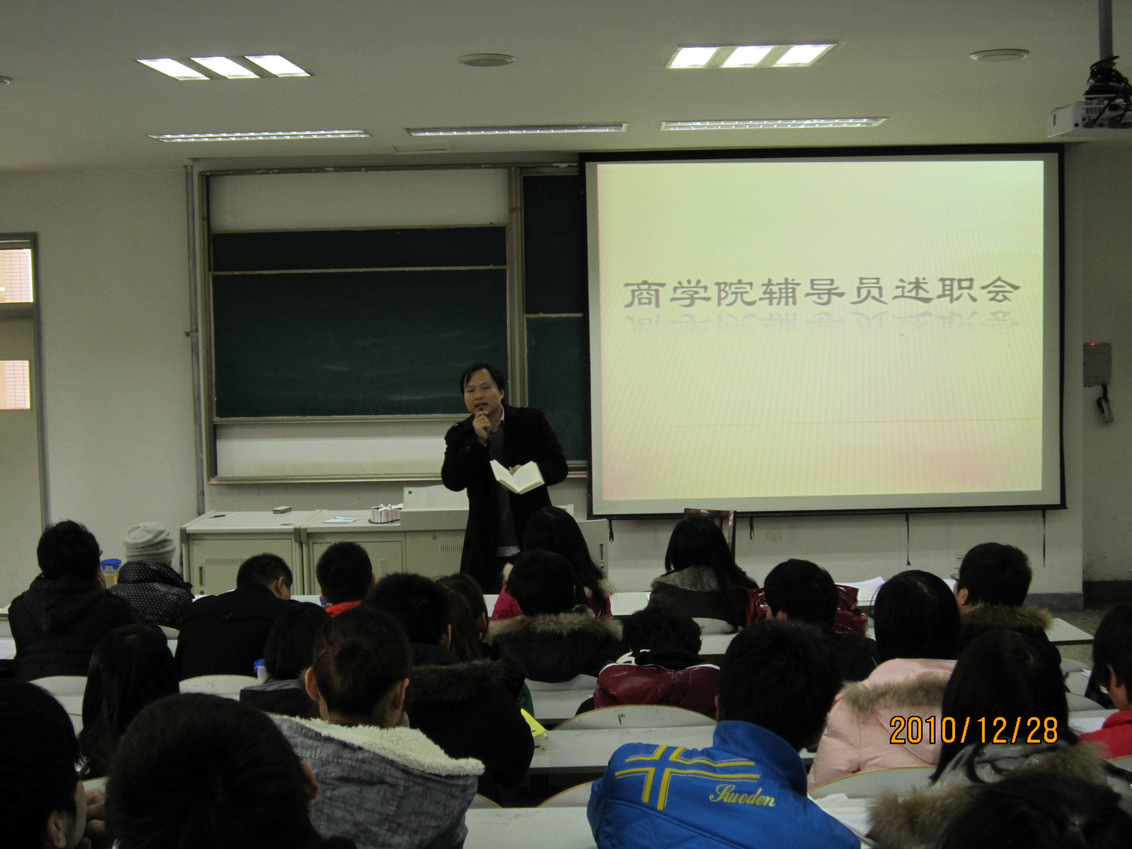 为了客观公正评价辅导员工作,总结经验,交流心得,吃瓜网 于2010年12月28日在教一153、159、131、梁林1号楼424举行辅导员述职报告大会。吃瓜网 党委书记左军老师、副书记郝文静老师,学校学生工作处副处长姚颖超老师出席会议。吃瓜网 近800名学生参加述职报告会。