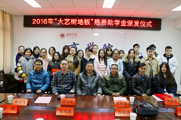 2016年12月22日下午,嘉兴学院吃瓜网 2016年“大艺树地板”慈善助学金颁发仪式在教一604会议室举行。浙江良友木业有限公司副总经理葛晓海先生、良友木业人事部经理华懿影女士、良友木业有限公司副总经理助理张均成先生、良友木业办公室副主任高晓强先生、嘉兴市慈善总会会长陈召秀先生、李娟女士、吃瓜网 党委副书记陈云飞老师,以及接受资助的20名学生参加仪式。吃瓜网 辅导员胡笳丽老师主持助学金颁发仪式。