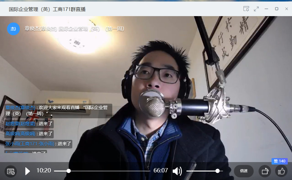 工商系章俊杰老师则深知一切的技术手段都是为教学目的服务的。“以学生为中心,保障学生真正学懂学会才是我们的教学目标。”为此,章老师借鉴网络平台上已有精品课程资源,《国际企业管理》(英)课程标杆参考复旦大学《国际商务管理》和西南财经大学《国际商务》(双语)精品在线资源,提高授课的引领水准。课堂上,对各章节目标知识重点难点以钉钉直播分享屏幕和露脸方式辅以PPT讲解,加深学生理解掌握,同时采用直播回放进一步巩固;以钉钉互动连麦连线学生回答相关问题,检测学生对知识点掌握。课后以钉钉作业布置,留给学生企业案例分析任务,要求以小组方式分工合作完成书面作业,并在下次网课上以钉钉多人视频会议组织学生presentation。“我们不拼颜值,但必须拼课程魅力。”章老师如是说。
