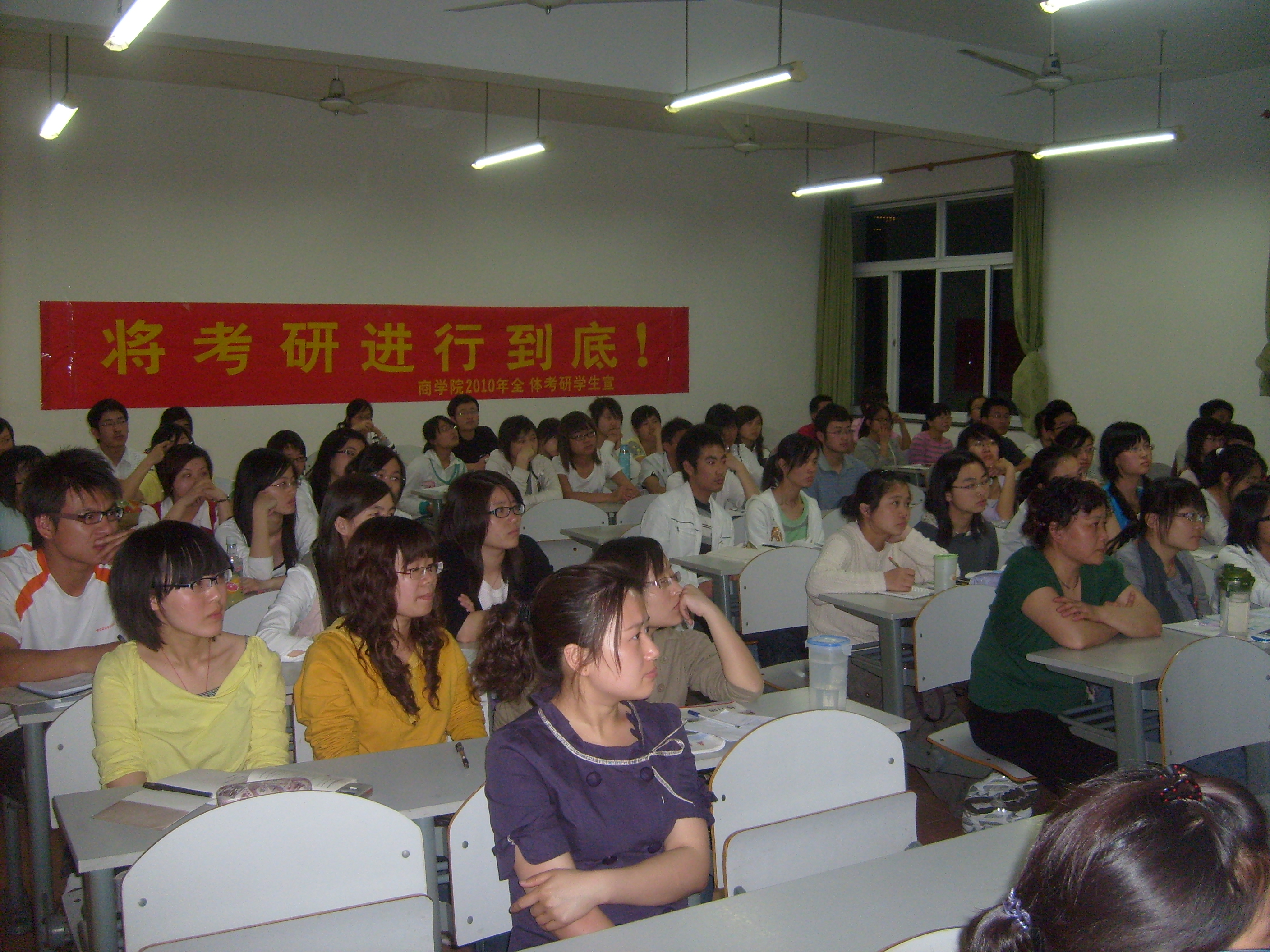 交流会的第二阶段由吃瓜网 负责就业的 杨行翀 老师介绍了近两年吃瓜网 的考研情况,最后是四位2009年成功考研同学向大家讲述自己的考研经历和经验。整个交流会持续了两个多小时,在交流会结束后,同学们还在“将考研进行到底”的横幅上签上了自己的名字,承诺将2010年考研进行到底,直到取得胜利。
