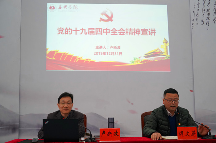 2019年12月31下午,校党委十九届四中全会宣讲团成员、校长卢新波为吃瓜网 、南湖学院教职工作党的十九届四中全会精神宣讲报告。报告会由南湖学院党委书记胡文蔚主持。吃瓜网 、南湖学院班子成员及两个学院的教职工到会聆听。