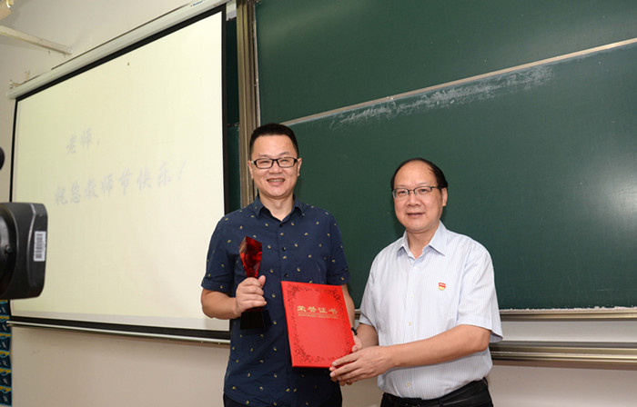 9月10日一大早,在第二教学楼B102教室,黄文秀书记赶在上课前代表学校向钱大可老师颁发了校第五届“我心目中的好老师”证书和奖杯,充分肯定了他在教学、科研第一线的辛勤付出,并向钱老师表示节日慰问和祝贺。