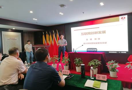 活动现场全体党员重温了入党誓词。应嘉兴市温州商会党委的邀请,营销信管教师党支部金镇教授以“互联网创新发展”为主题为商会所属党支部的企业党员们开展业务知识讲座。嘉兴市温州商会党委书记朱克友结合对企业竞争市场环境的关切,围绕中美关系与中国伟大复兴主题为在场党员们讲授一堂生动的主题党课。