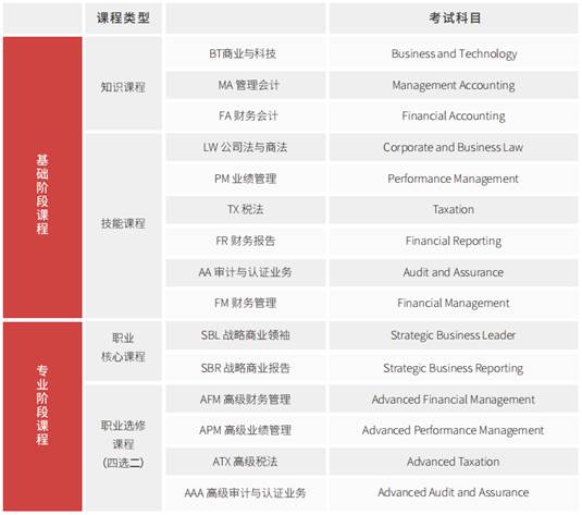 ACCA考试大纲是全球公认的领先财经教育体系,其充分表达了雇主和专业人士的意见,反映了现代商务社会对财务人员的要求。在学习过程中使学员全面掌握会计、财务管理、审计、税务及经营战略等方面的专业知识,提升分析能力并拓展战略思维。大纲共有十五门课程(需完成十三门课程),分为基础阶段和专业阶段两个阶段,基础阶段包括知识课程和技能课程,专业阶段包括职业核心课程和职业选修课程。具体课程设置和考试规则如下: