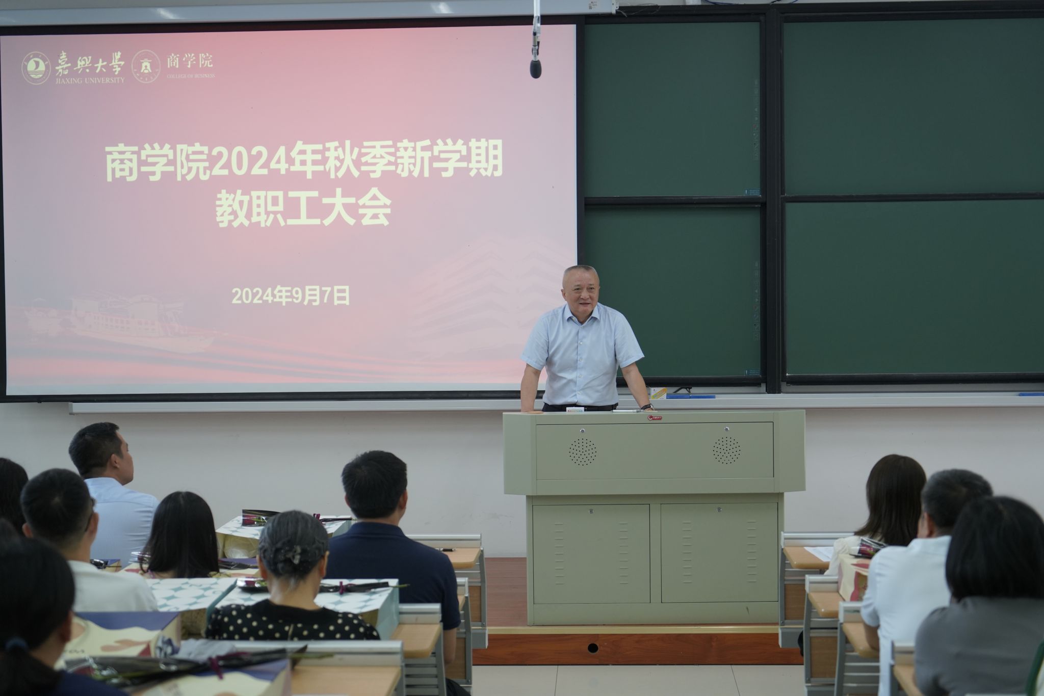 虞岚传达了党的二十届三中全会、学校全面深化改革会议暨暑期中层干部(扩大)读书会等会议精神,并对做好新学期师德师风建设、安全稳定工作和110周年校庆等工作进行了安排部署。最后,虞岚代表学院向全体教职工的辛勤付出表示感谢并提前祝大家教师节快乐。