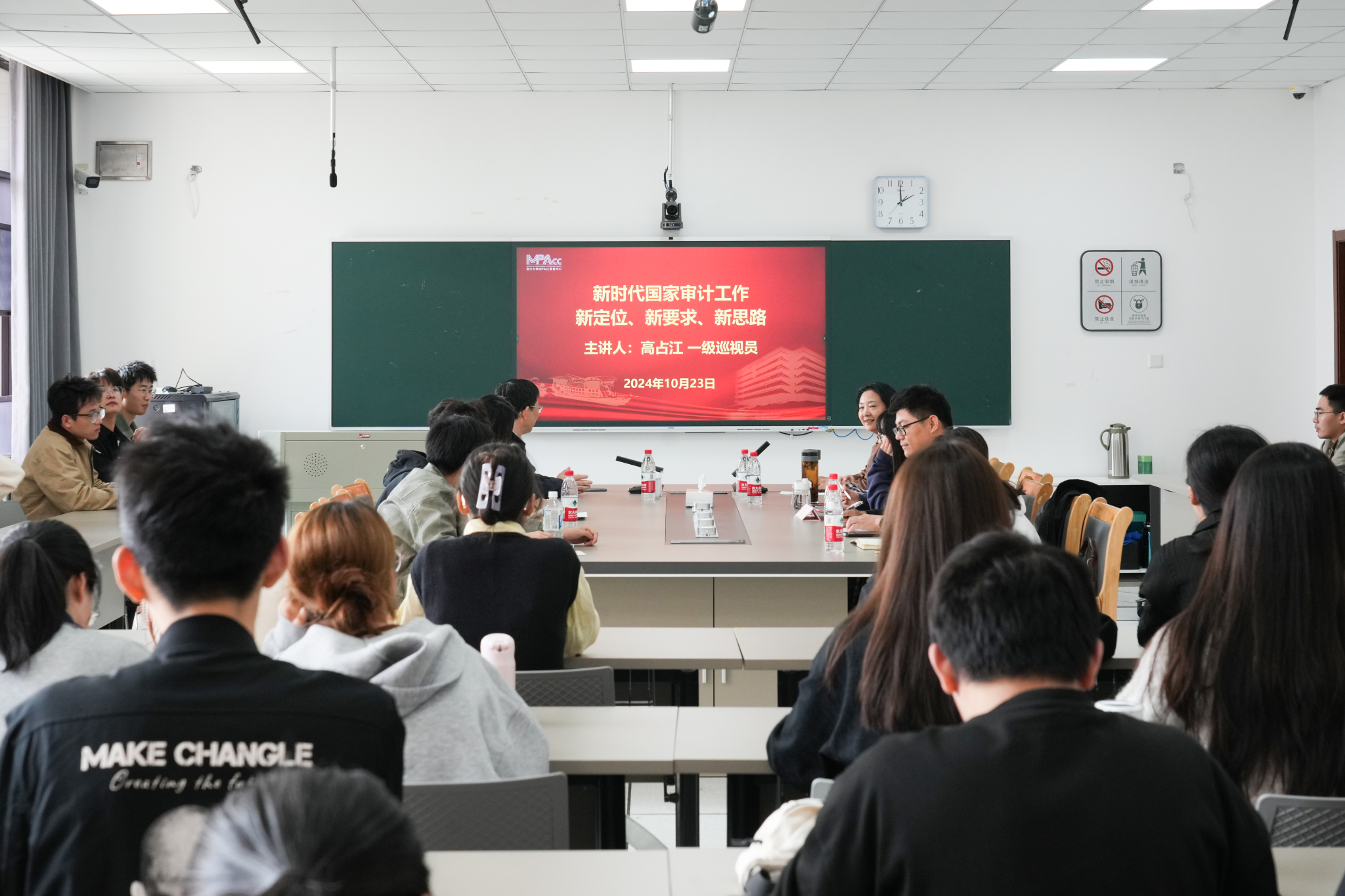10月23日下午,MPAcc名家讲坛第十期在尚德楼311开讲,浙江省审计厅原党组成员、省经济责任审计工作联席会议原办公室主任、一级巡视员、浙江工商大学特聘教授高占江受邀担任主讲嘉宾,以“新时代国家审计工作新定位、新要求、新思路”为主题进行精彩讲座。讲座由MPAcc教育中心主任潘煜双主持,会计系教师代表、2024级会计硕士共计70余人到场聆听讲座。
