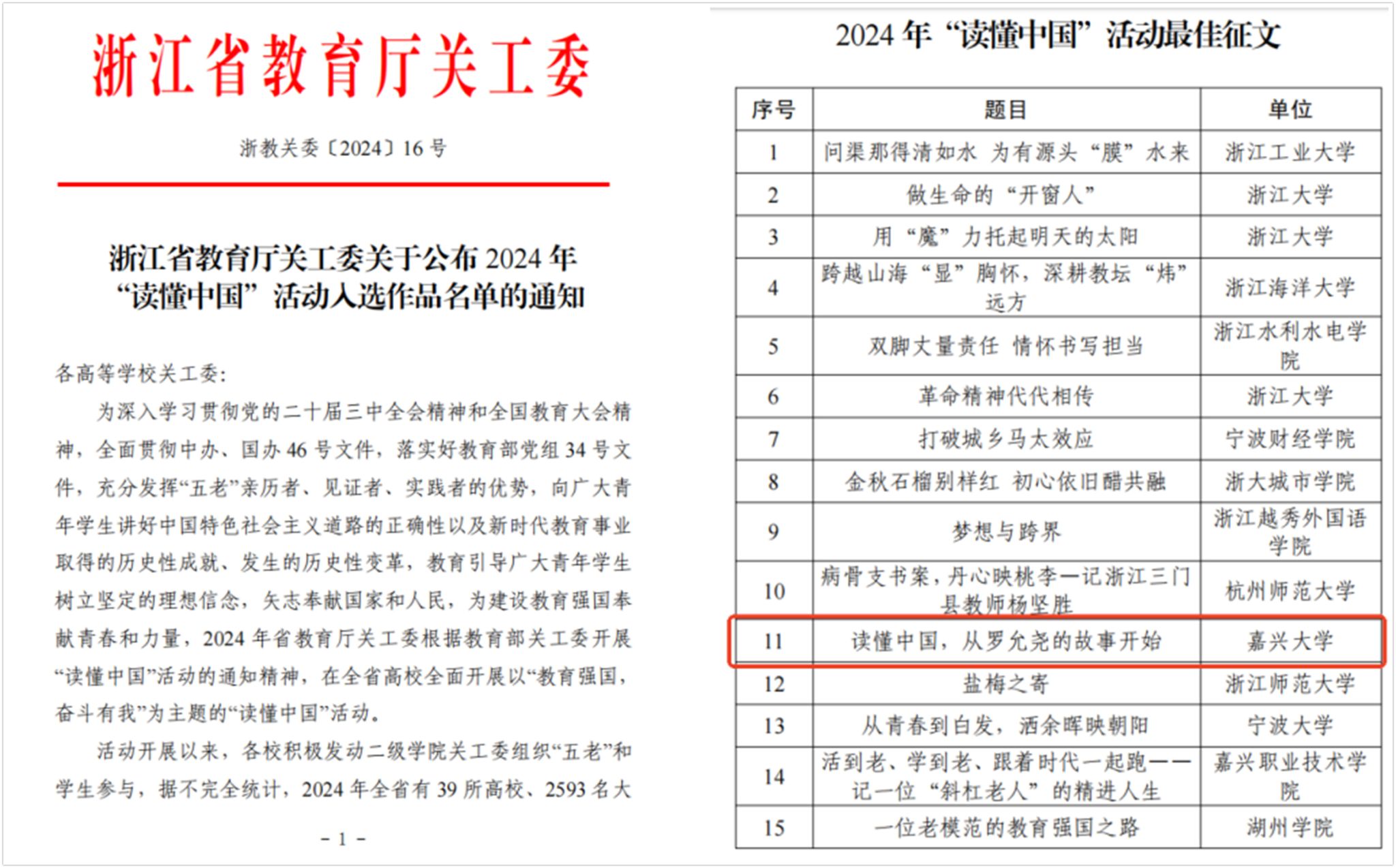 近日,浙江省教育厅关工委公布了2024年“读懂中国”活动获奖名单。我院推荐作品《读懂中国,从罗允尧的故事开始》(作者:工商211吕凯;指导教师:李雨嘉;采访对象:罗允尧)从 578 篇作品中脱颖而出,被评为2024 年“读懂中国”活动优秀征文。