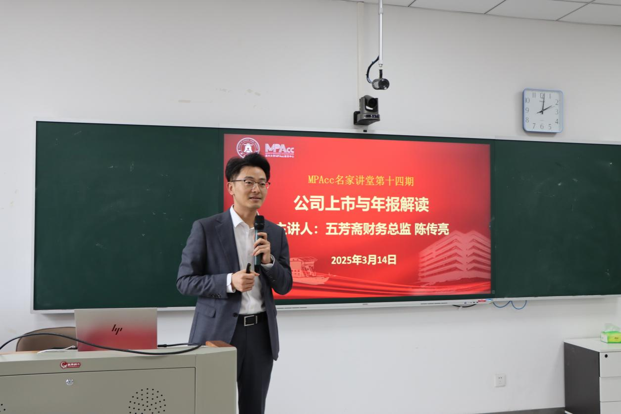 3月14日下午,MPAcc名家讲坛第十四期在尚德楼311精彩开讲,五芳斋财务总监、正高级会计师陈传亮担任主讲嘉宾。讲座由MPAcc教育中心主任潘煜双教授主持,会计系、财务系教师代表、2024级会计硕士共计70余人参加。