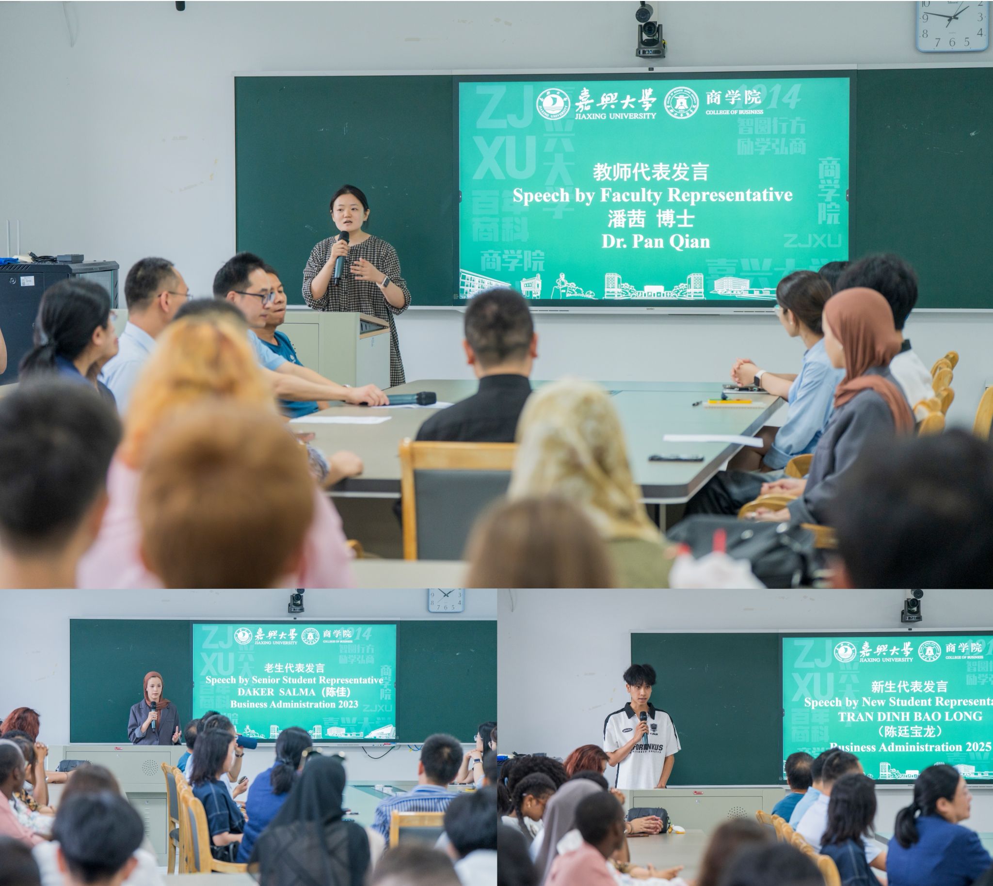 随后,工商管理系教师代表潘茜博士、2023级老生代表DAKER SALMA以及2025级新生代表陈廷宝龙分别发言。潘茜博士代表教师向新生表示热烈欢迎,并鼓励大家保持好奇心与学习热情;DAKER SALMA分享了在吃瓜网 学习生活的收获与感悟;陈廷宝龙代表新生表达了对未来学习生活的期待与信心。