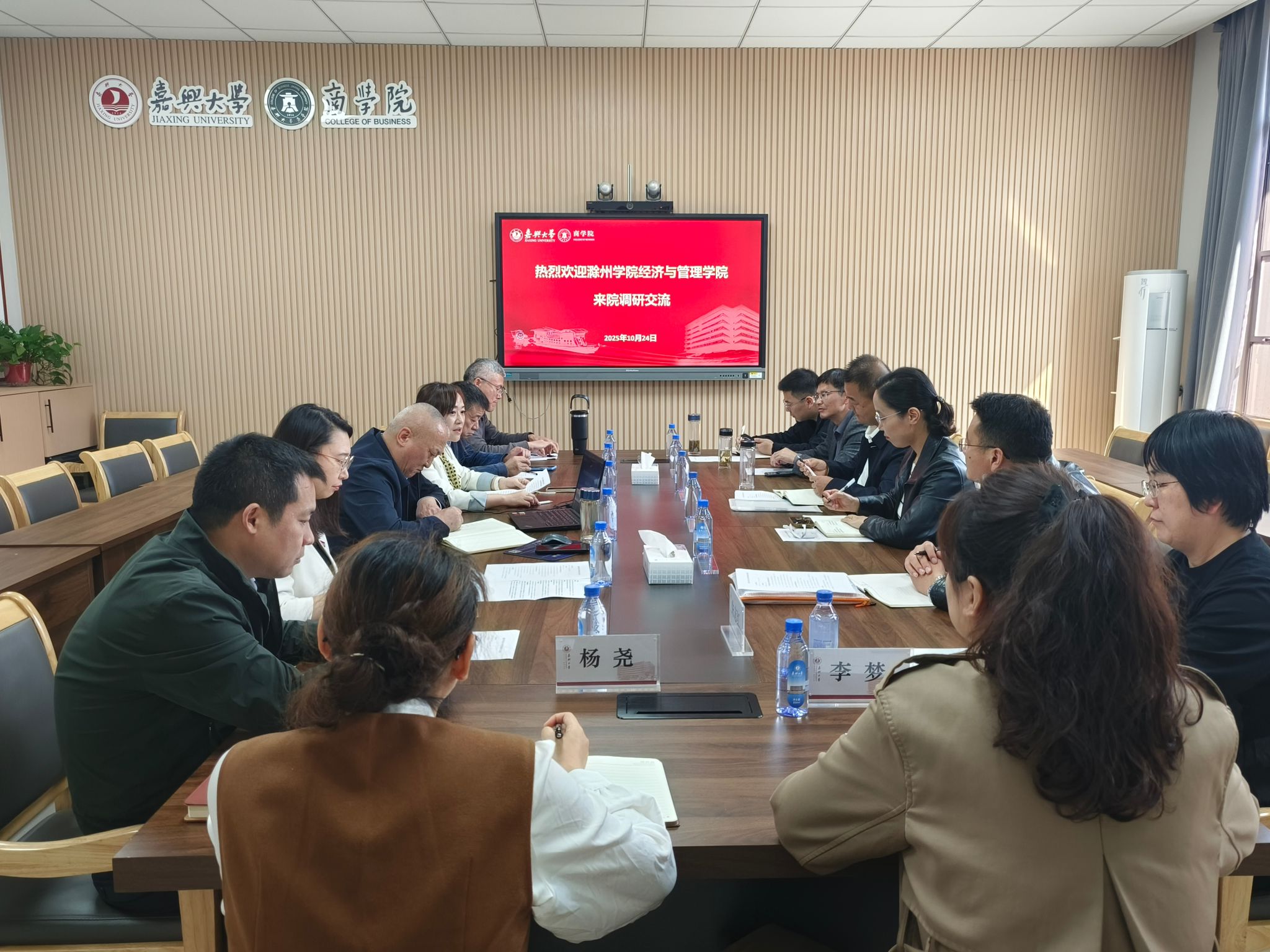 10月24日下午,滁州学院经济管理学院党委书记张悦、院长王琦一行来吃瓜网 调研交流。吃瓜网 院长李勇、党委书记虞岚、学术副院长智佳宁及相关负责人参加交流座谈。会议由李勇主持。