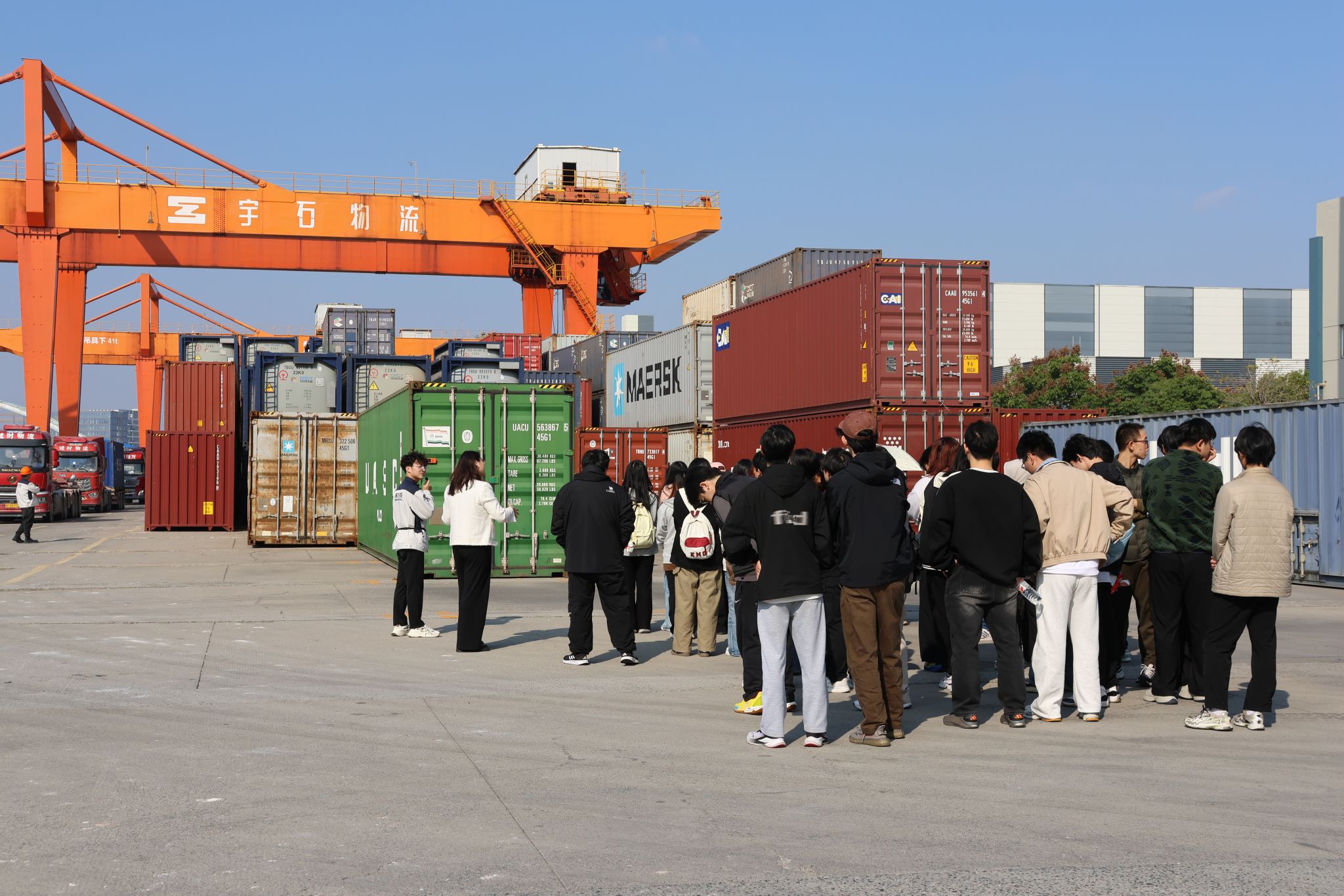 在宇石物流码头,师生实地观摩了内河港口的作业流程,包括桥吊与场桥协同完成集装箱起吊、平移等操作。企业代表介绍了空箱与重箱的分区管理策略,以及堆场管理在提升效率和降低成本方面的作用,相关介绍视频将作为专业课程案例教学素材。通过观察从船舶靠泊到集卡疏运的全流程,学生对港口运营及集装箱运输实务有了更直观的理解。此次实地教学环节,有助于学生进一步理解物流枢纽在供应链中的实际作用。