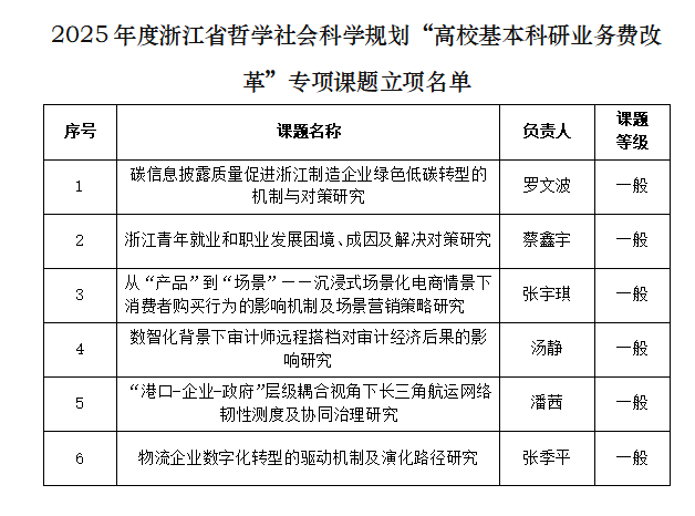 2024年9月20日,浙江省哲学社会科学工作办公室发布了《关于公布2025年度浙江省哲学社会科学规划课题等立项名单的通知》。吃瓜网 共有8位教师的项目立项,其中包括2项常规课题(重点课题1项),以及6项“高校基本科研业务费改革”专项课题,整体立项率达到了73%。