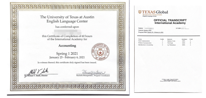 图:奥斯汀分校语言文化项目证书&成绩单样图