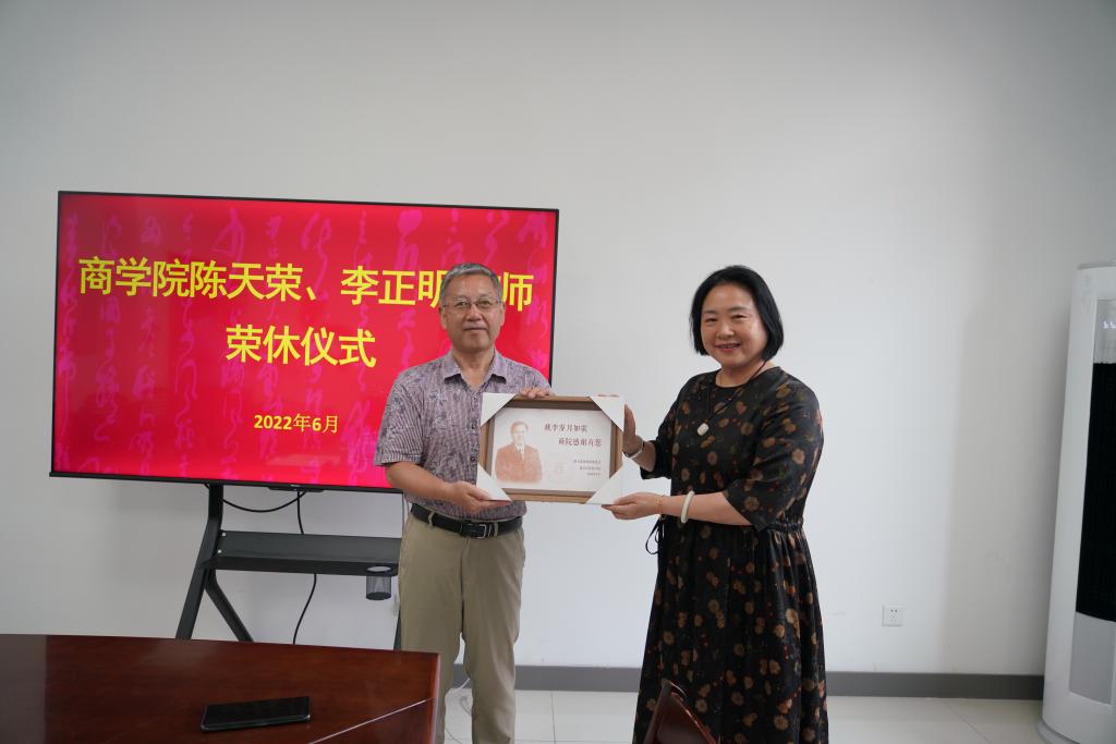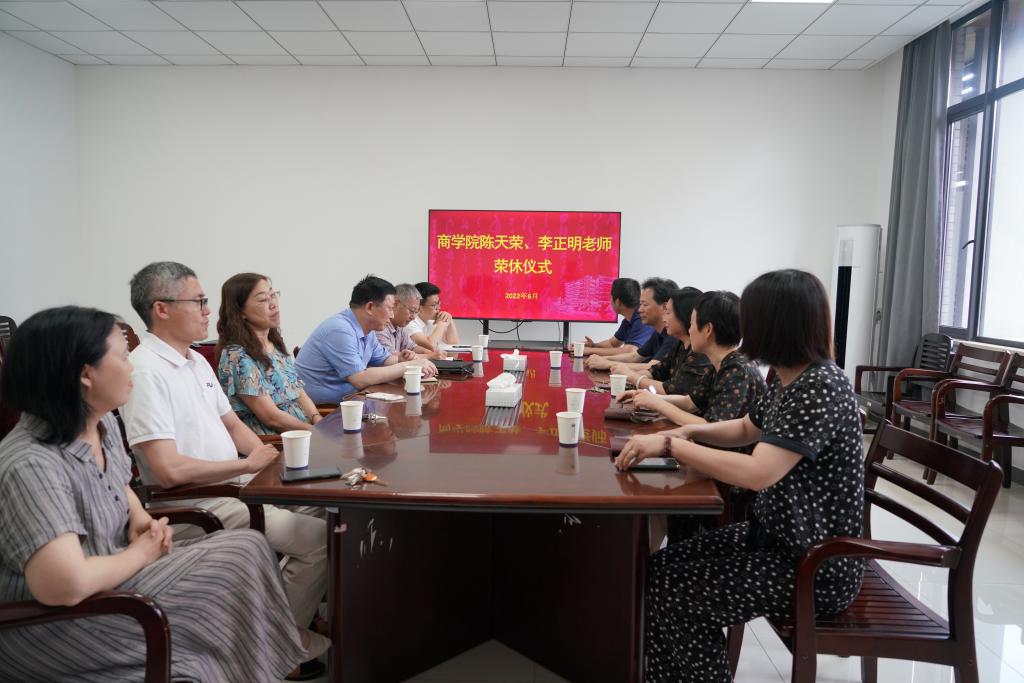 6月21日下午,吃瓜网 在尚德楼345会议室举行陈天荣、李正明老师荣休仪式。学院党政领导班子成员及工商系、财务系教师代表参加仪式。