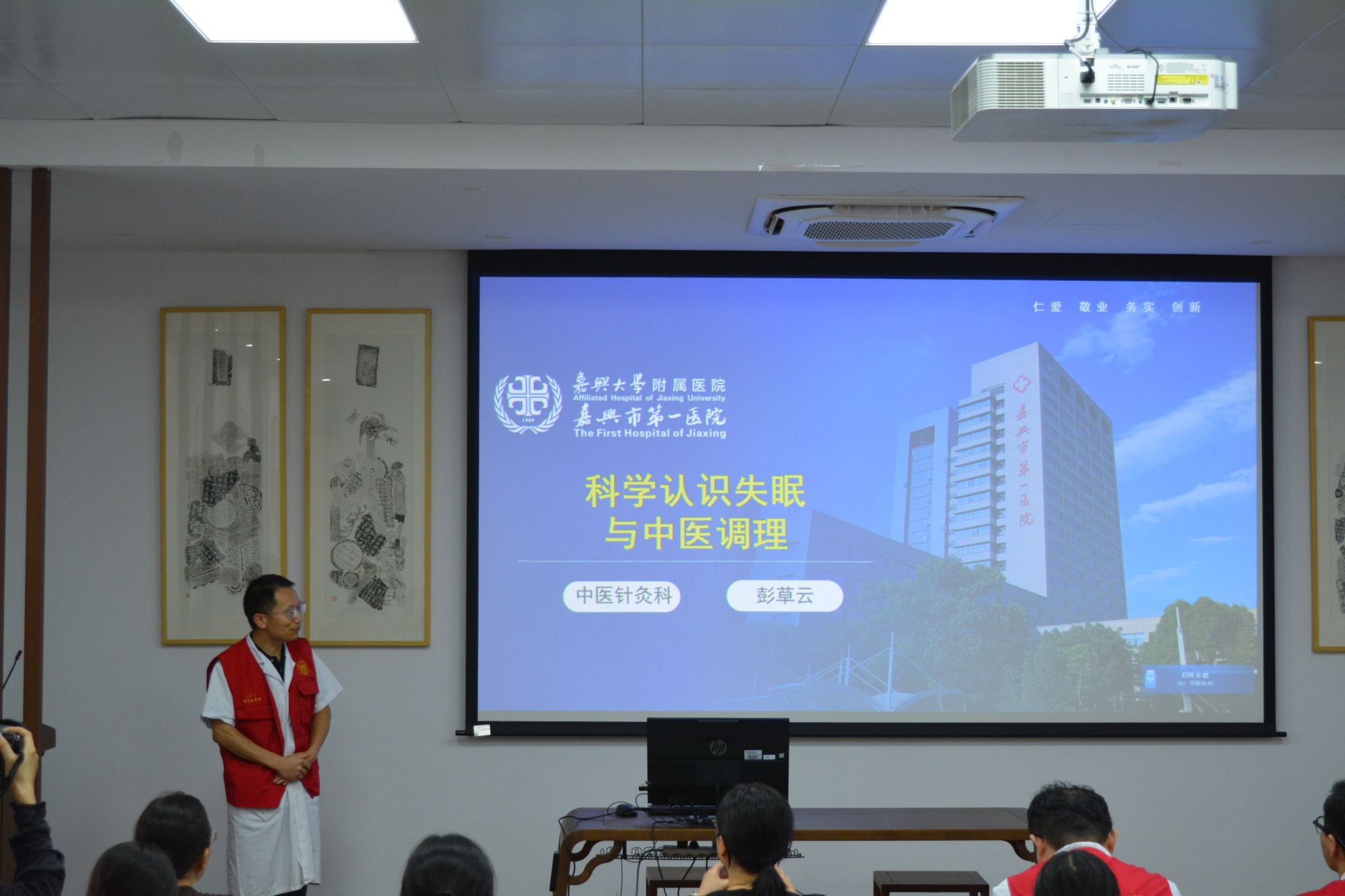活动伊始,特邀嘉兴市第一医院中医专家、主任中医师彭草云博士以“科学认识失眠和中医调理”为主题开展讲座。彭草云结合当下教职工工作节奏快、压力大的普遍现状,从失眠的定义、类型切入,用通俗易懂的语言解析了失眠的常见诱因;并针对大家关心的“如何判断是否为病理性失眠”“长期失眠对身体的潜在危害”等问题进行详细解答。