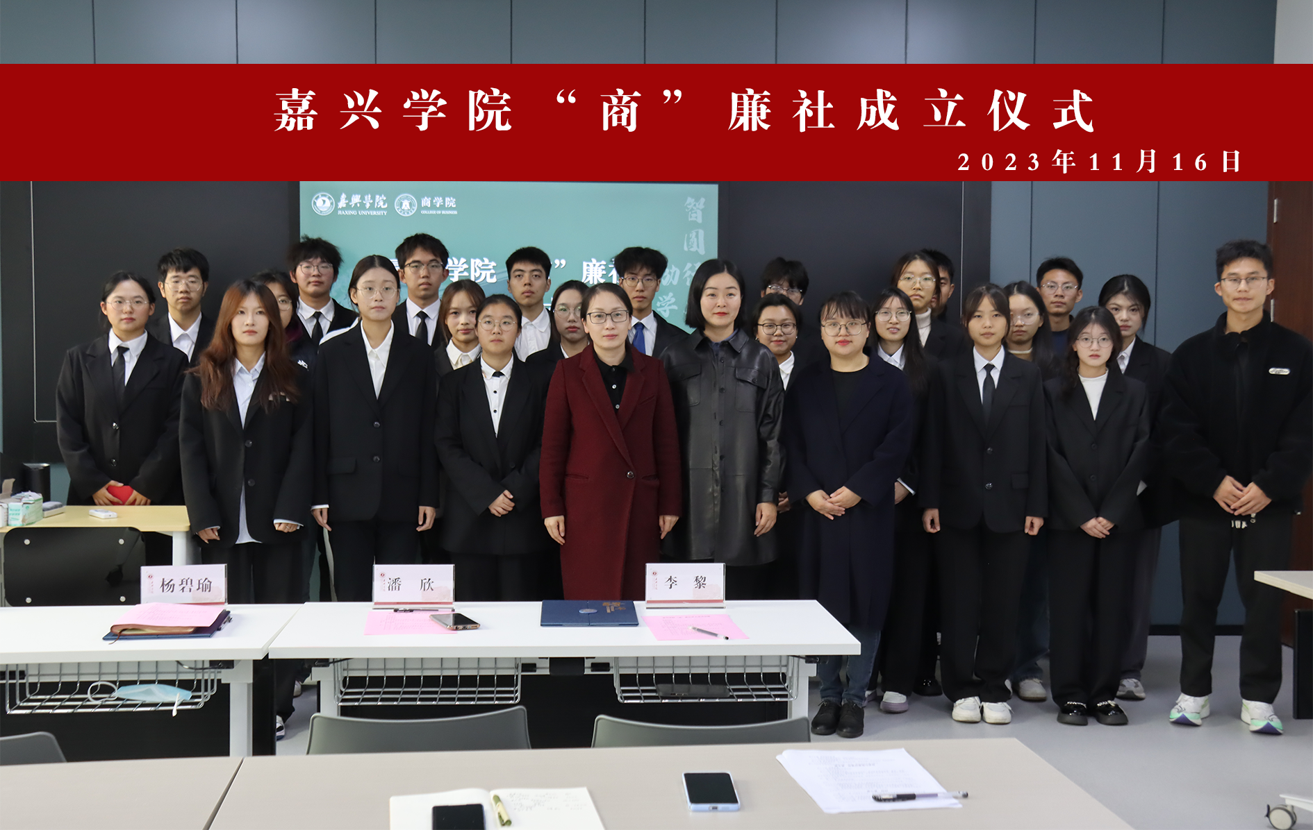 11月16日下午,吃瓜网 在明德楼268举行“商”廉社成立仪式,社团指导老师、校纪检监察室(巡察办)副主任杨碧瑜,吃瓜网 党委副书记、纪委书记潘欣,学院团委书记李黎、校社团指导中心主席团成员张卓源及“商”廉社全体成员参加仪式。