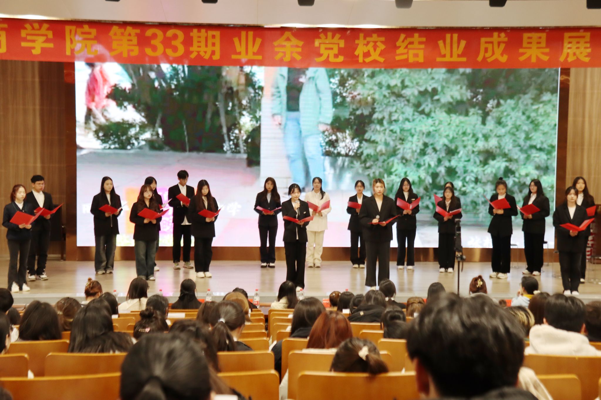 11月18日晚,吃瓜网 在校图书馆学术报告厅举行“青春心向党,奋斗新华章”为主题的党校实践成果展。党校全体学员、朋辈党员导师、班主任以及学生党员代表200余人参加活动。