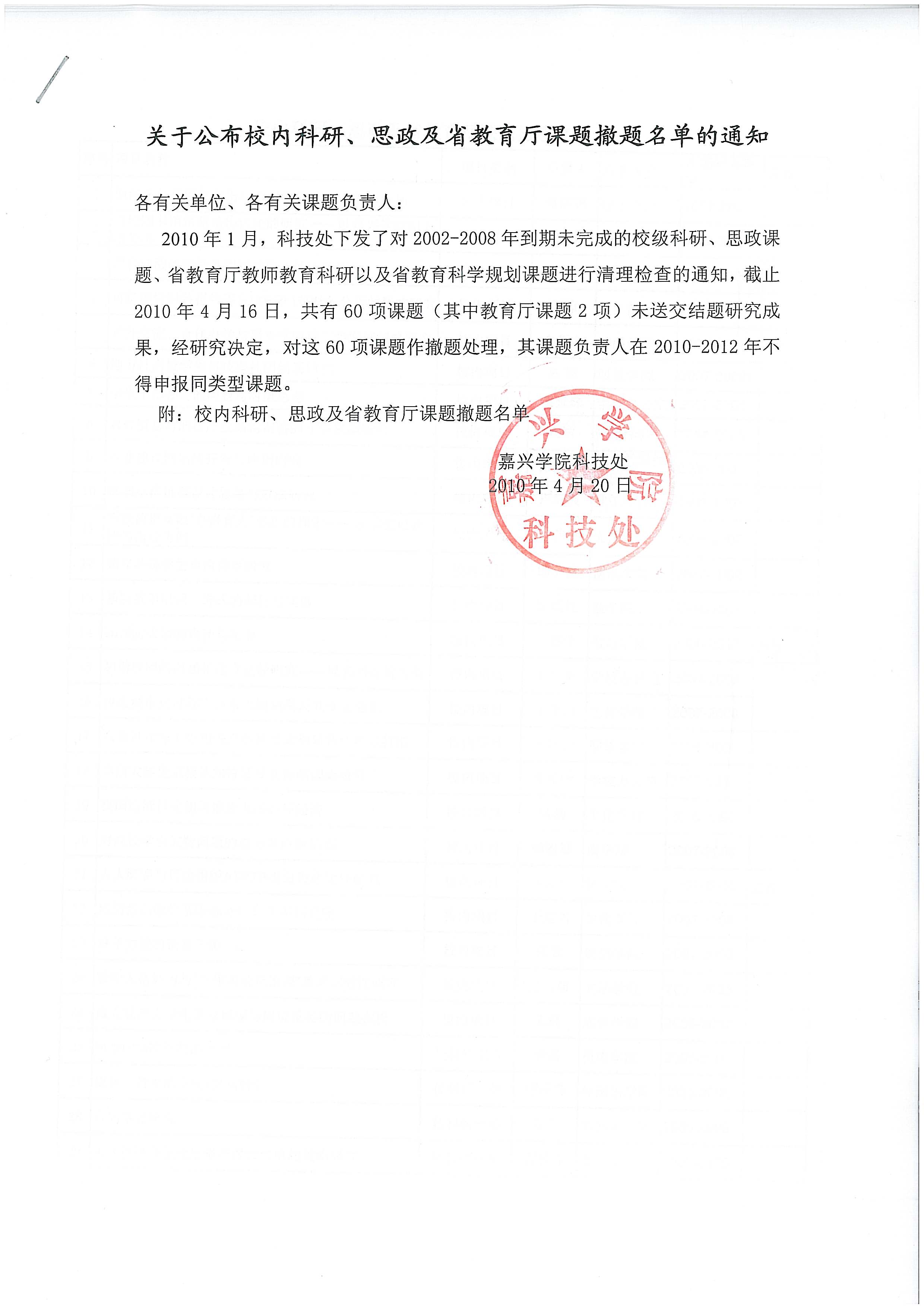 20101月,科技处下发了对2002-2008年到期未完成的校级科研、思政课题、省教育厅教师教育科研以及省教育科学规划课题进行清理检查的通知,截止2010年4月16日,共有60项课题(其中教育厅课题2项)未送交结题研究成果,经研究决定,对这60项课题作撤题处理,其课题负责人在2010-2012年不得申报同类型课题。