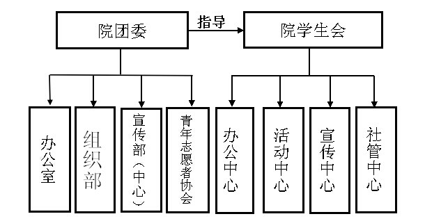 团委下设组织部、宣传部、办公室3个部门,其中宣传部与学生会宣传中心合署,青年志愿者协会由团委直接指导管理。