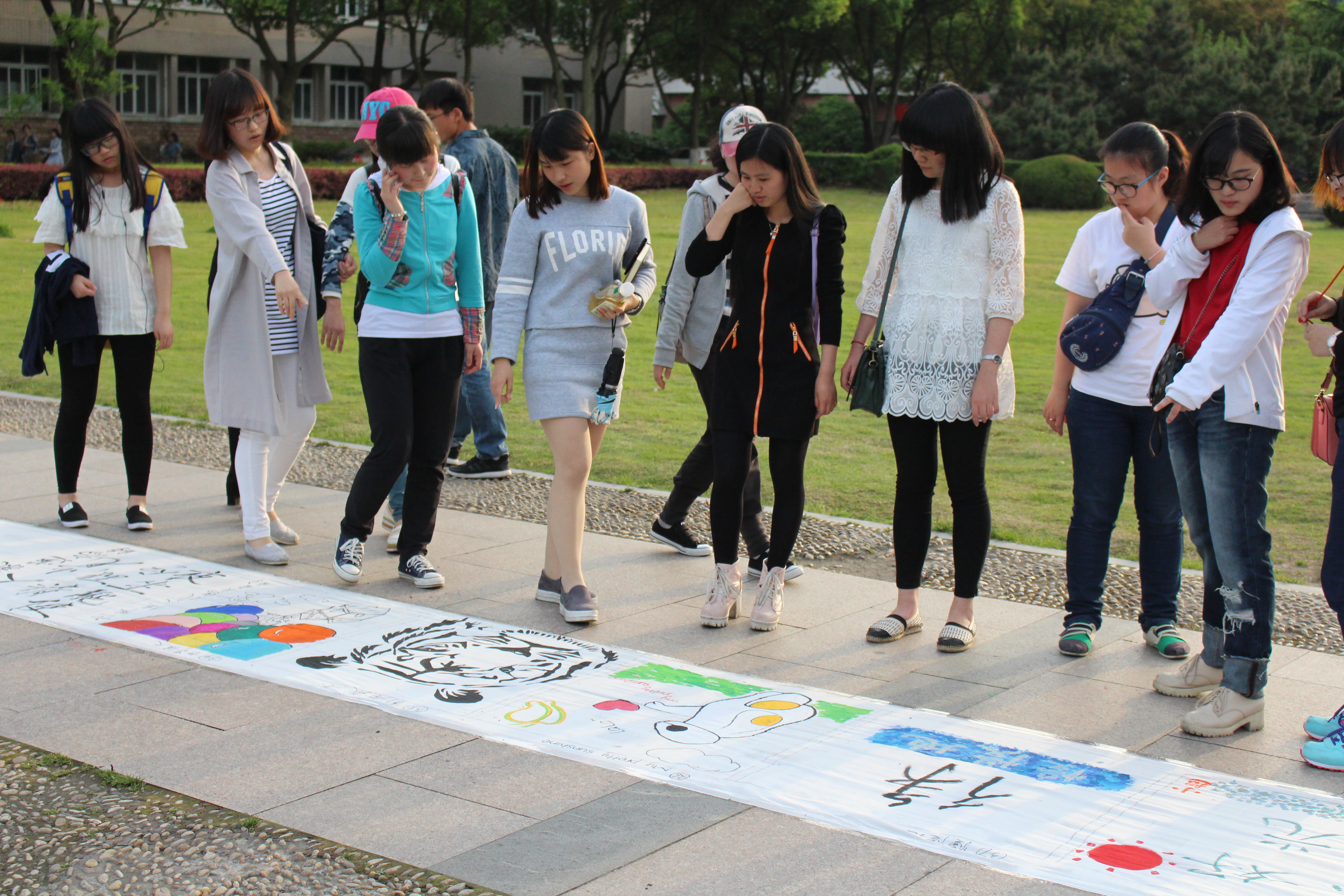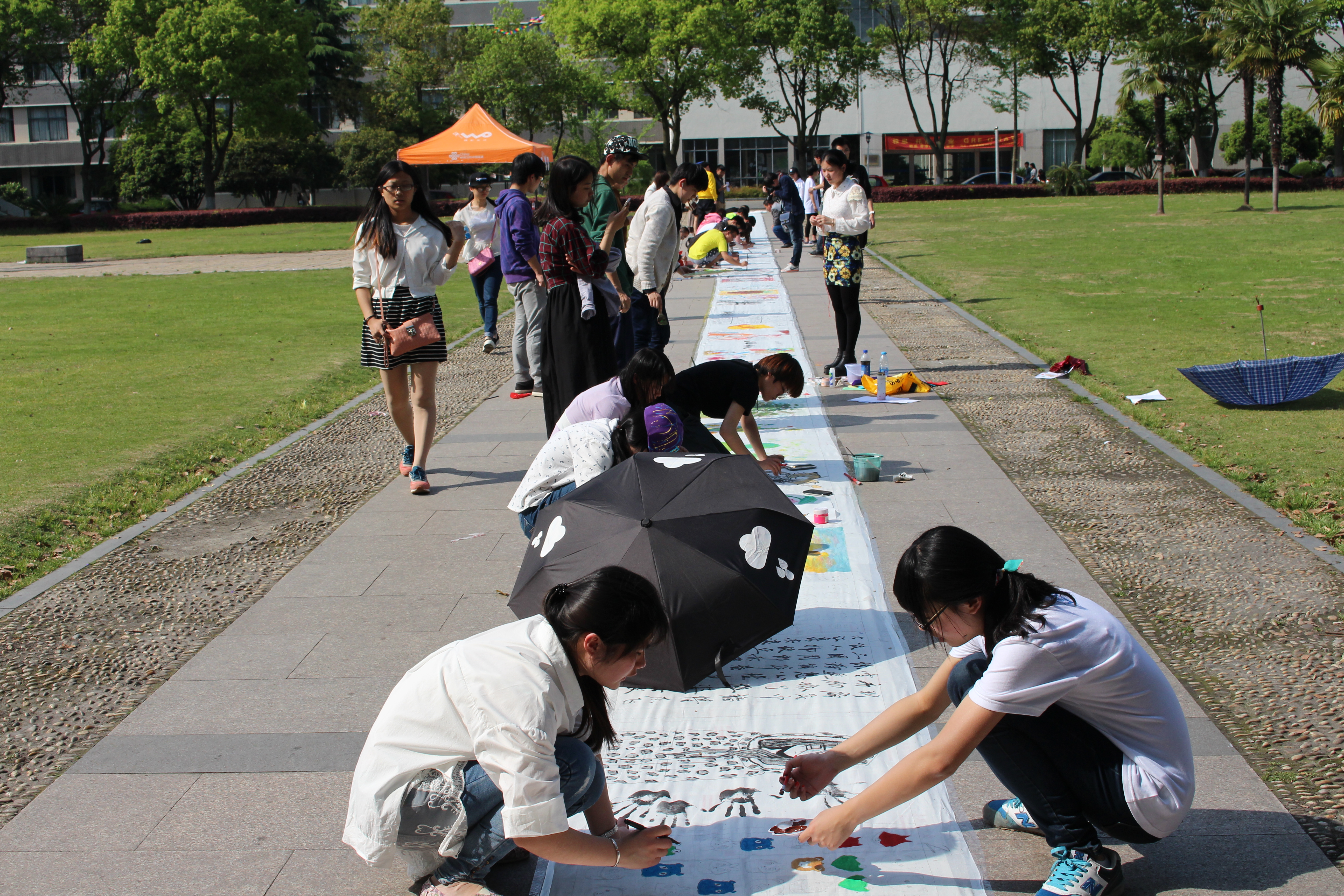 下午一点整,长达百米的画卷在文化广场铺开,参加百米长卷的同学挑选好自己需要的材料之后,便开始用色彩涂抹自己的青春;有参加摄影大赛的同学,将自己精心拍摄的“瞬间”提交给工作人员后也在长卷上留下了自己的手笔。过路的同学们也被精彩的活动所吸引,甚至一群参观嘉院的小朋友纷纷现场一展身手,也在画布上留下了他们充满童真的图画。