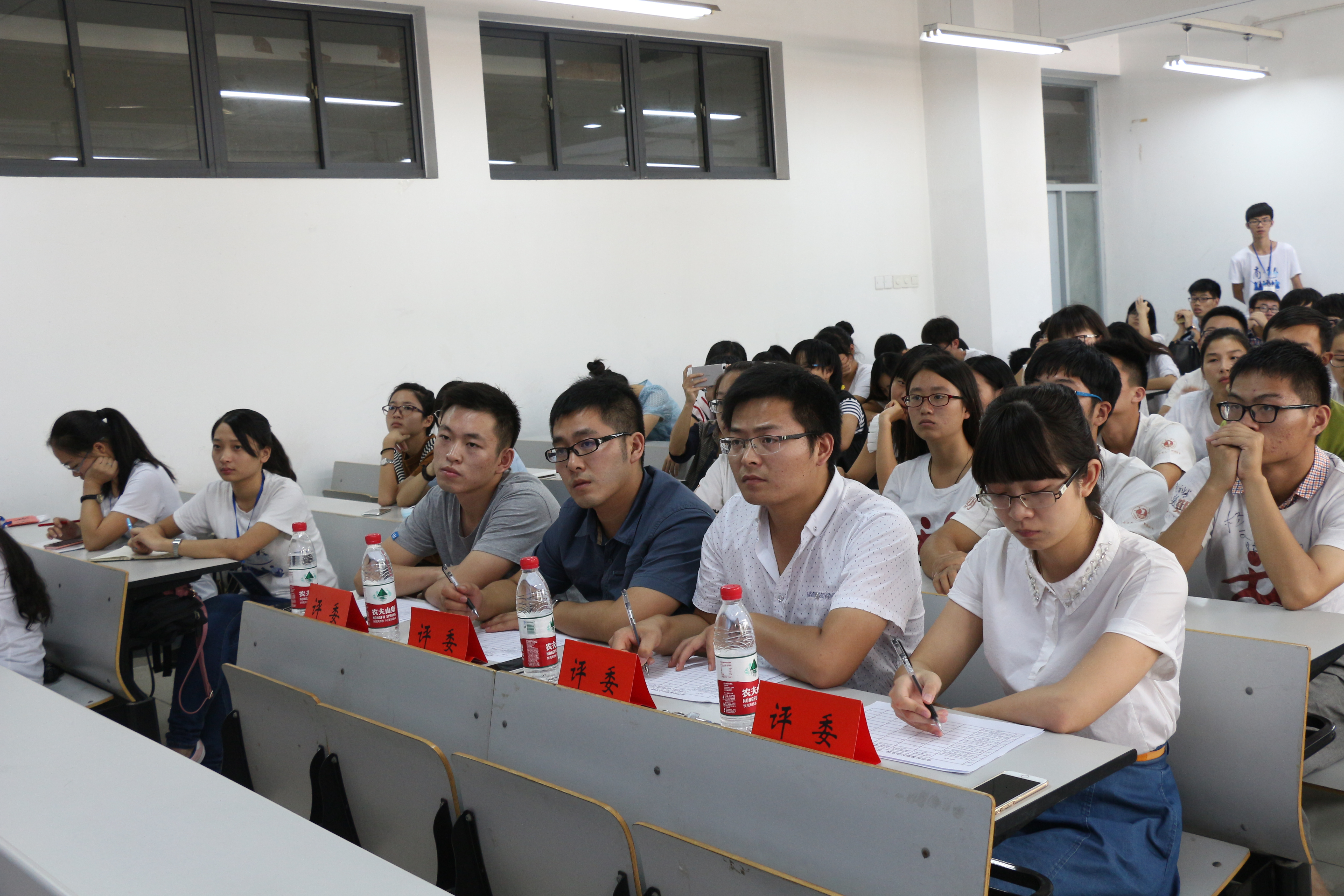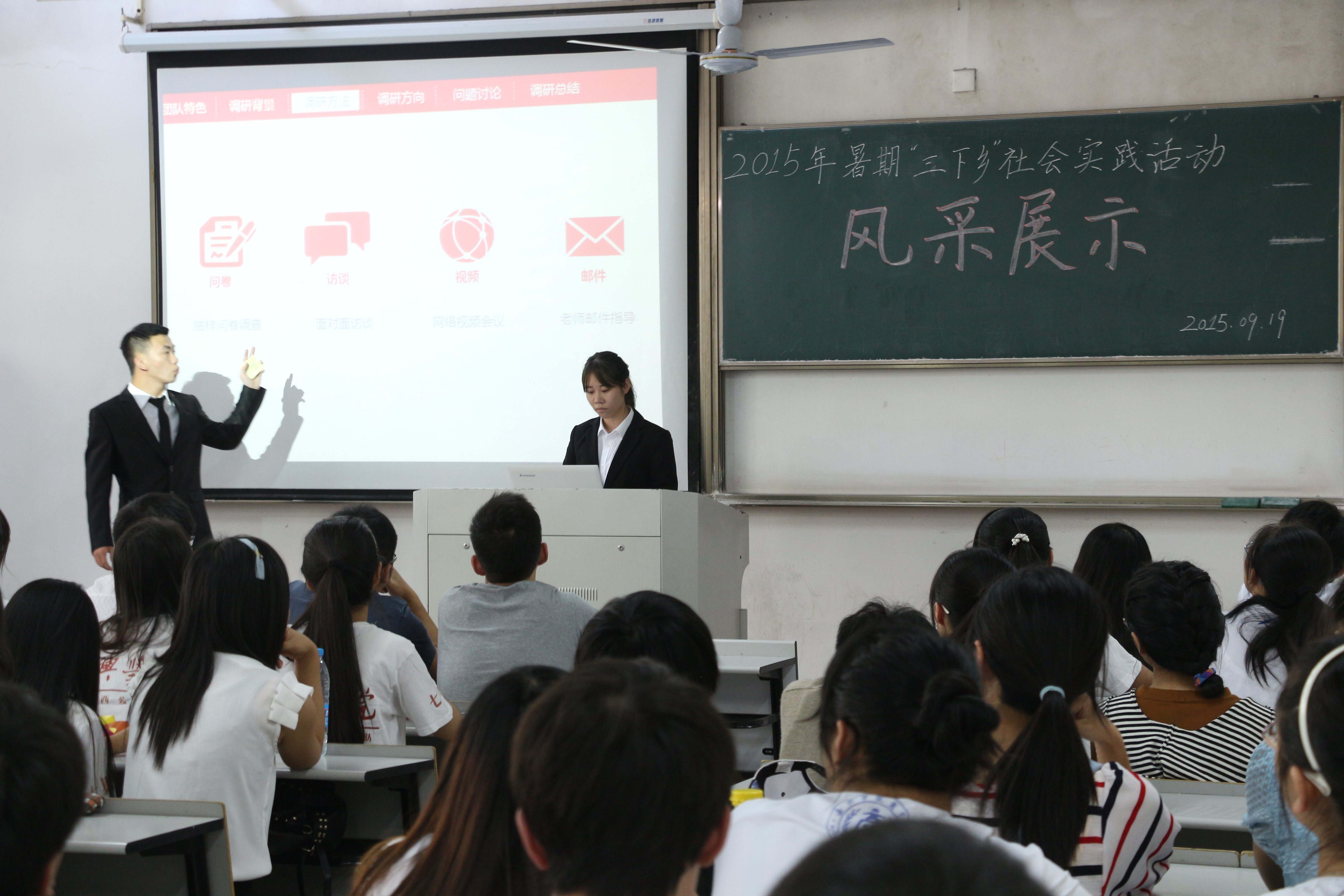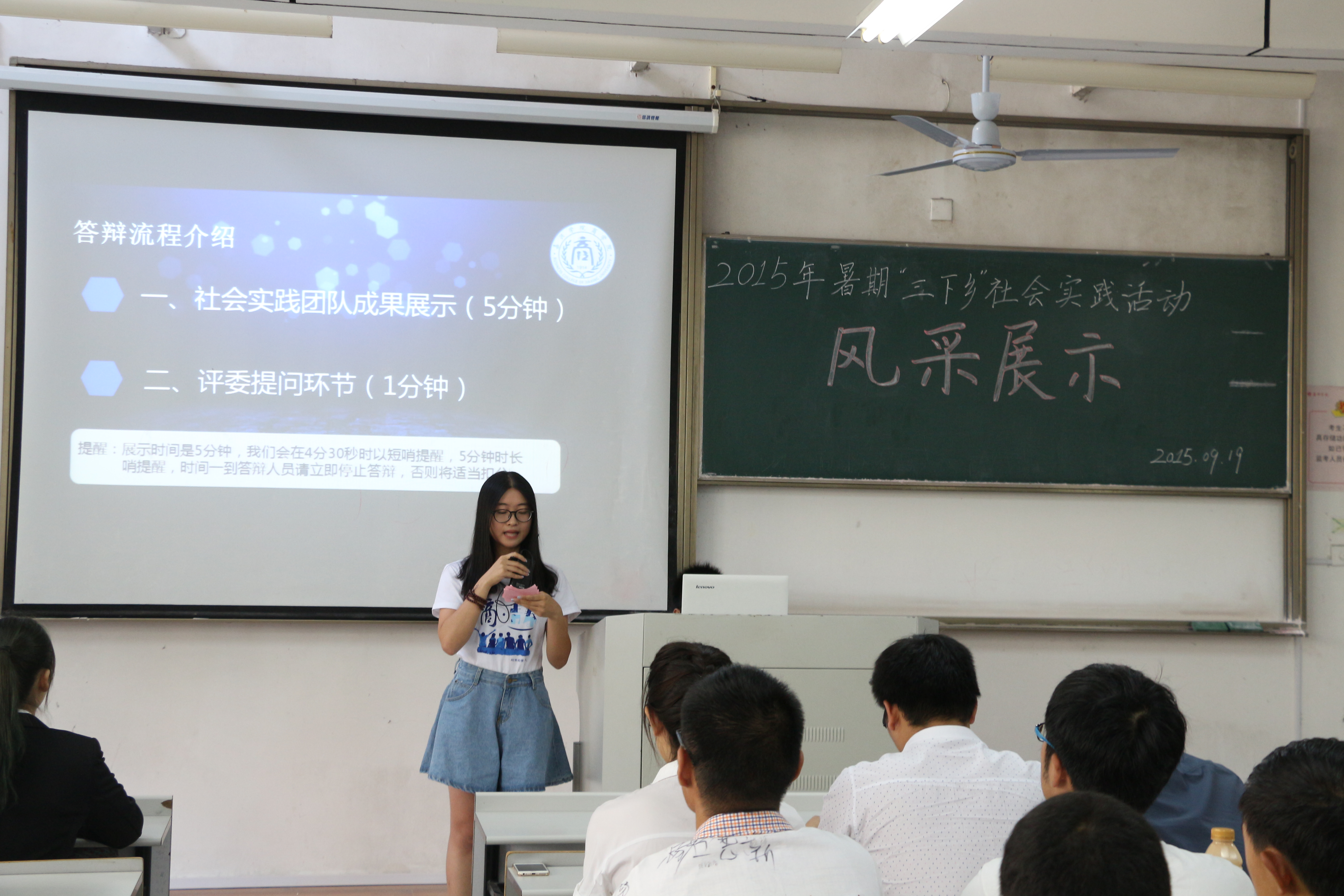 9月19日下午,吃瓜网 2015年暑期“三下乡”社会实践风采展示在教二B106如期开展。吃瓜网 团委李朋朋老师、左飞龙老师、团委副书记阮鋆燕、团委办公室主任刘俊担任评委。