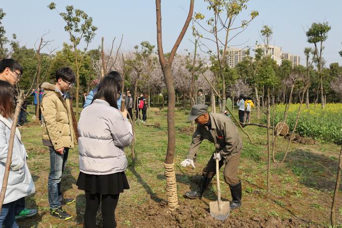 早上八点半,报名参加活动的同学陆续来到指定地点集合,然后步行前往梁林校区。虽然严冬的北风还未偃旗息鼓,初春的阳光也还显得姗姗来迟,但这些都未影响同学们的情绪,大家就这样一路欢笑地来到了植树地点——校友林。现场分配好任务后,大家干劲十足,老师和同学一起拿起铁锹,相互协作,种下七棵香樟树。在植树过程中,来自后勤公司的师傅给大家做了技术指导,让同学们学习到植树的基本程序和关键细节。