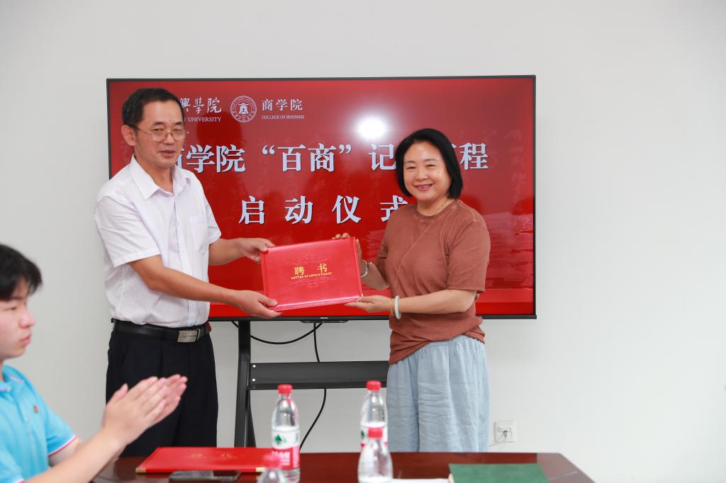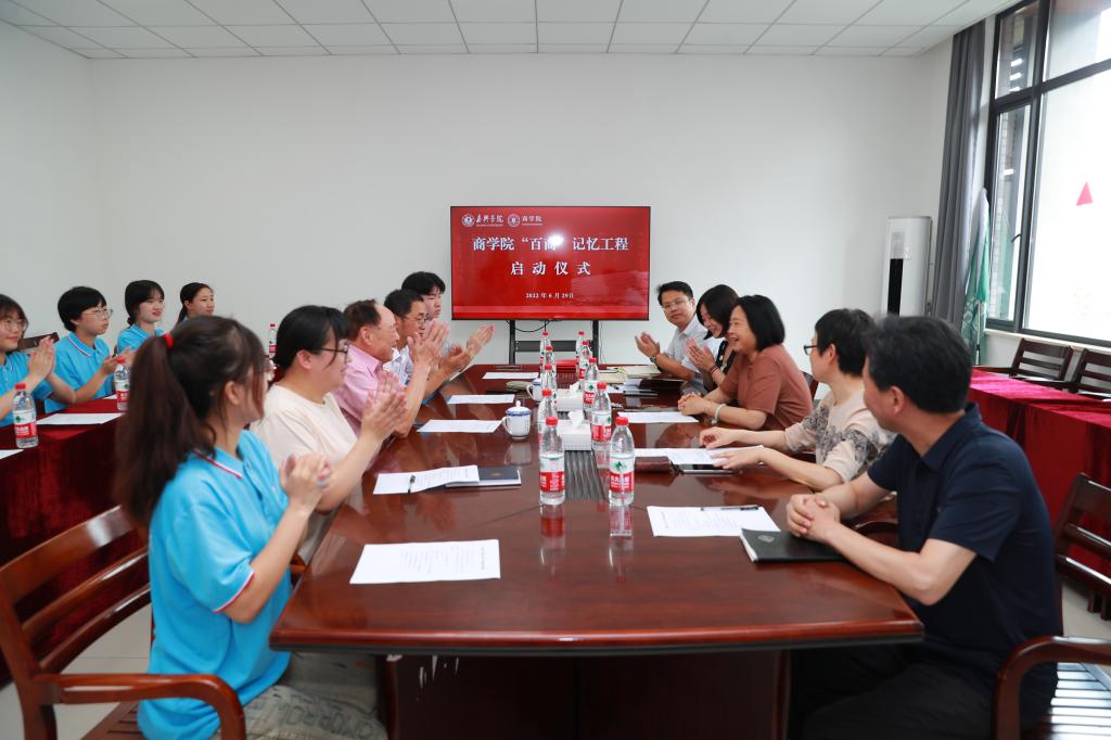 “百商”记忆工程启动仪式在尚德楼345会议室举行。学院党政领导、“百商”记忆工程“老先生”顾问团顾问罗允尧,校档案馆馆长、“百商”记忆工程专业指导顾顺奎出席仪式,“百商”记忆青年志愿服务队成员代表参加活动。仪式由学院党委副书记潘欣主持。