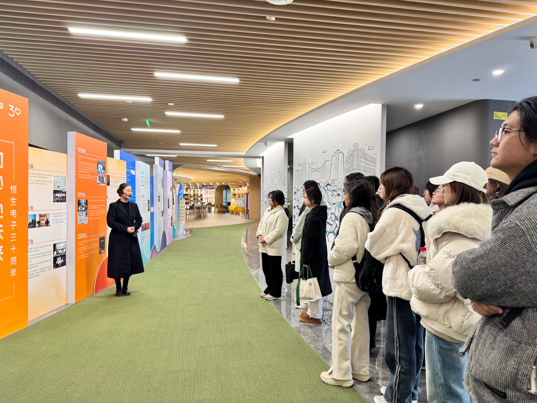 活动伊始,师生走进恒生电子展厅,在专业讲解中沉浸式感受金融科技企业的工作场景、团队文化与业务生态。从办公空间到技术展区,同学们跳出“校园视角”,直观感知职场实景,为后续生涯规划积累了宝贵的实践经验。