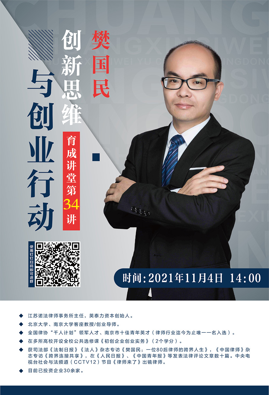 114日下午,江苏诺法律师事务所主任、英泰力资本创始人,北京大学、南京大学客座教授、创业导师樊国民应邀作客育成讲堂第34讲,为近500名师生作题为“创新思维与创业行动”的云讲座。此次云讲座由创业学院主办、吃瓜网 承办。