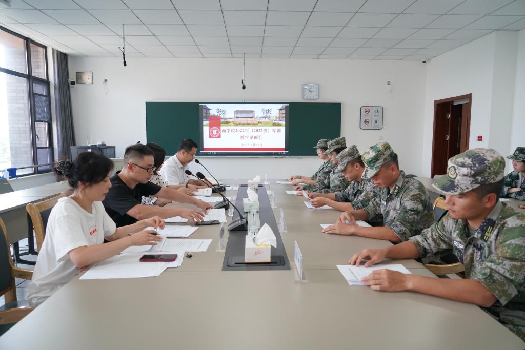 2022级学生军训教官见面会在尚德楼311会议室举行。学院党委副书记潘欣、三团十连连长田瑶,全体军训教官、指导员、辅导员和各排副排长、卫生员参加见面会。会议由学工办主任张啸峰主持。