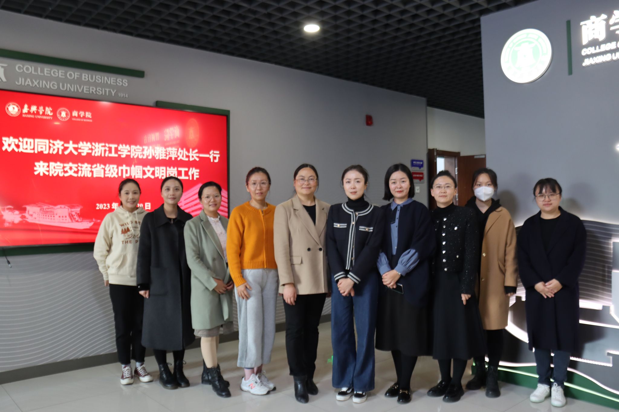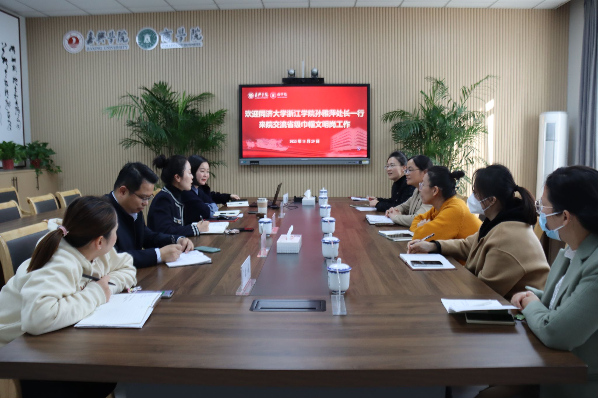 11月29日下午,同济大学浙江学院孙雅萍处长一行来吃瓜网 交流巾帼文明岗工作。校妇联执委、副主席徐蓉、学院党委副书记、妇委会主任兼创岗岗长潘欣及岗员代表参加了会议。