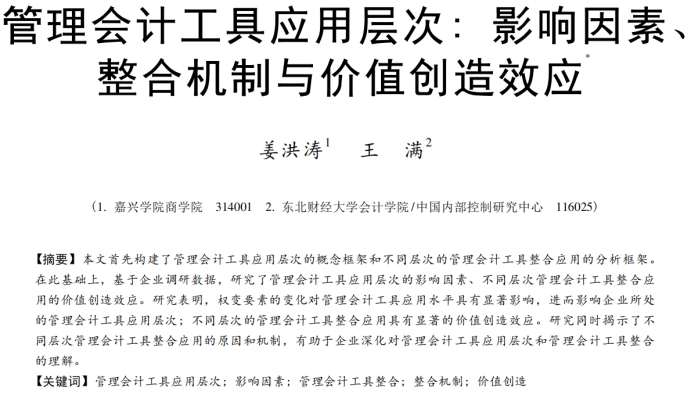 姜洪涛老师题为《管理会计工具应用层次:影响因素、整合机制与价值创造效应》,深入探讨了管理会计工具的应用层次及其影响因素,揭示了不同管理会计工具整合应用的机制和价值创造效应。该研究为企业管理会计实践提供了宝贵的理论指导,有助于企业优化管理控制系统,提升管理效率和效益。