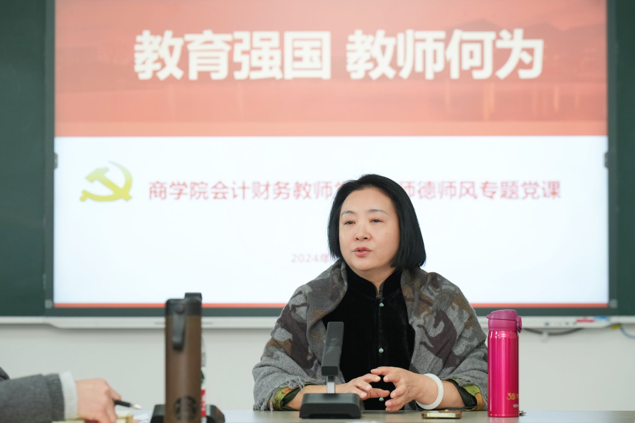 党课紧密聚焦“何为四有好老师?”“新时代高校教师职业行为十项准则”的核心要义。潘煜双紧密围绕立德树人根本任务,不断强化教师队伍的教书育人的使命感和责任感,向全体参会教师提出了“做人做事做学问”的目标要求。她强调,全体教师应当严格规范自身的教育教学行为,维护好教师的职业尊严与形象,秉持高觉悟、严律己、作表率的准则,矢志不渝地成为学生成长道路上的指引者。全体人员还共同学习了黄大年式教学团队的先进事迹。