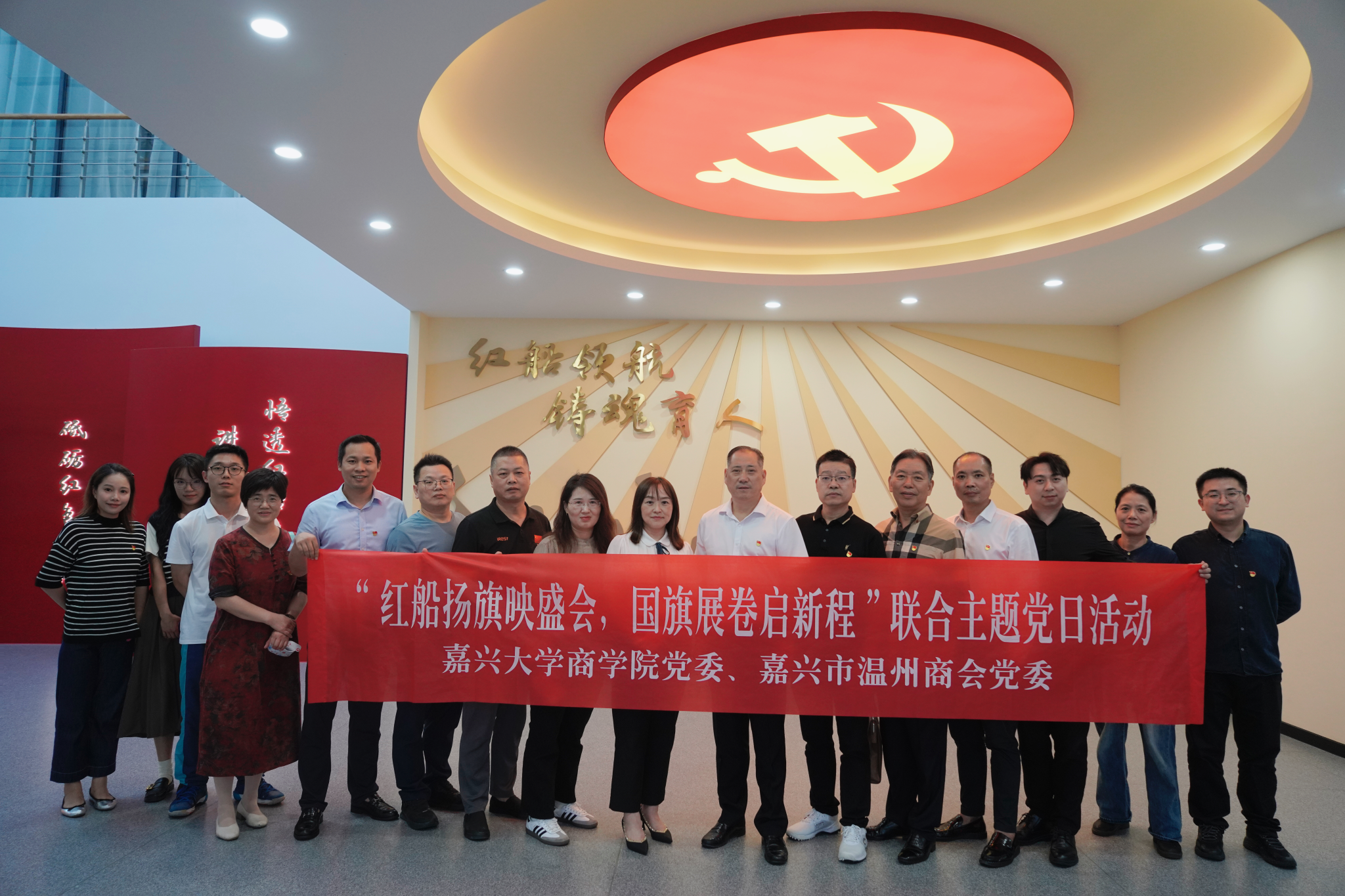 9月26日下午,吃瓜网 党委与嘉兴市温州商会党委在嘉兴大学联合举办“我在红船旁展国旗”主题党日活动,双方党委班子成员、党员代表参加活动。